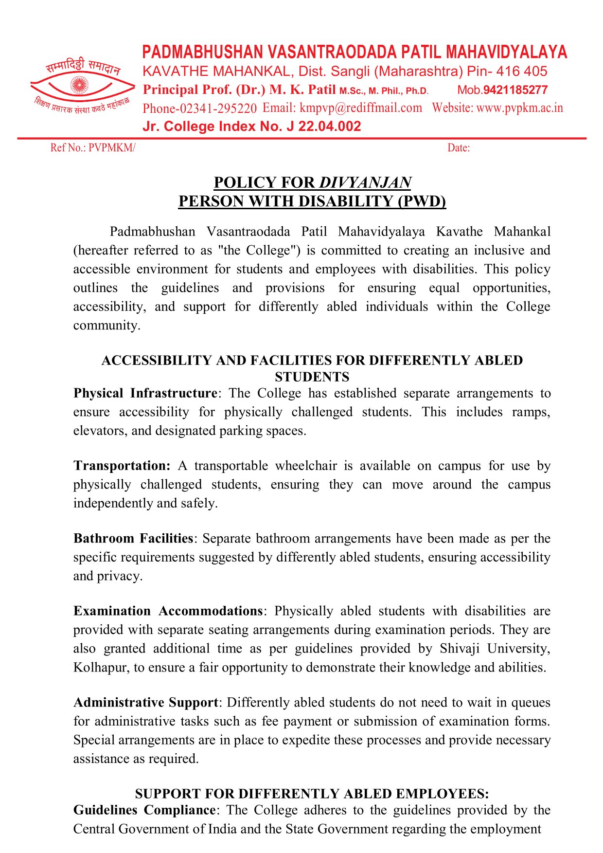 POLICY FOR DIVYANJAN PERSON WITH DISABILITY (PWD) Padmabhushan Vasantraodada Patil Mahavidyalaya Kavathe Mahankal (hereafter referred to as "the College") is committed to creating an inclusive and accessible environment for students and employees with disabilities. This policy outlines the guidelines and provisions for ensuring equal opportunities, accessibility, and support for differently abled individuals within the College community.