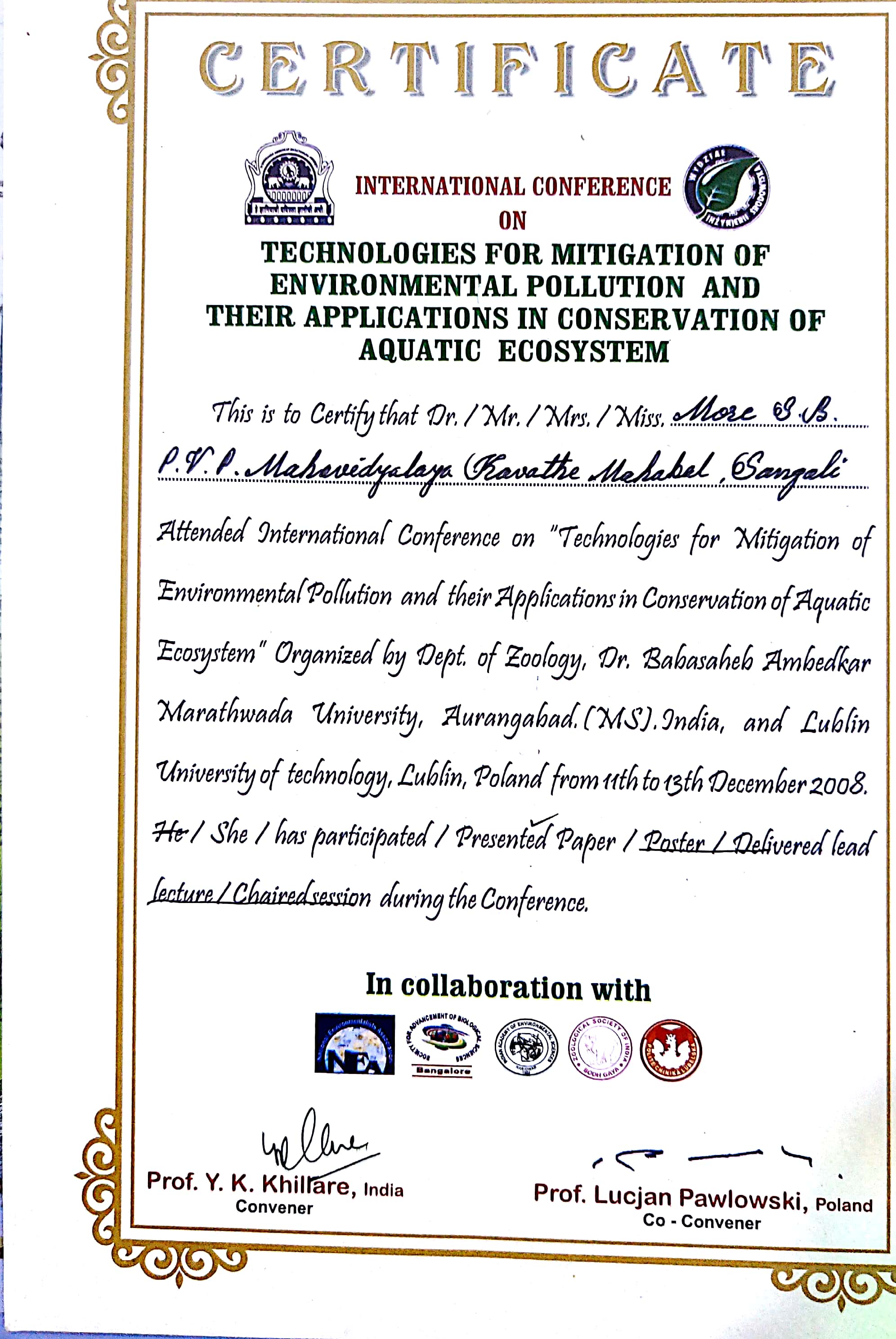 2008-09 Zoology Conference International Prof. (Dr.) Suvarna B. More International Conference on Technologies for mitigation of environmental0 pollution and their applications in conservation in aquatic ecosystem 11-12-2008 3 Attended_Paper_Presented View View