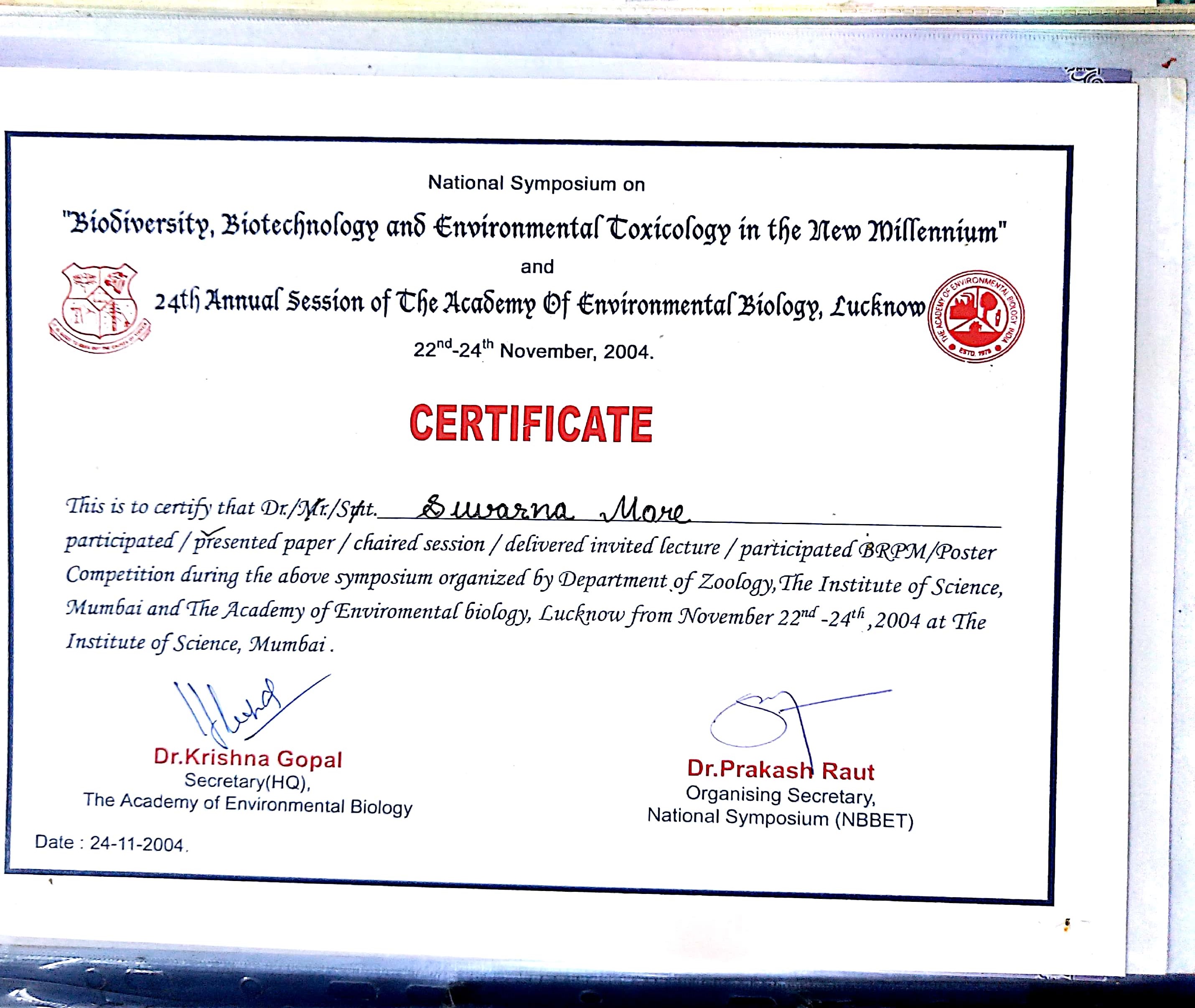 2004-05 Zoology Symposia National Prof. (Dr.) Suvarna B. More National Symposium on ‘Biodiversity, Bio-technology and Environmental Toxicology in the New Millennium’ and 24th Annual Session of the Academy of AEB, Luchnow 22-11-2004 3 Attended_Paper_Presented View View