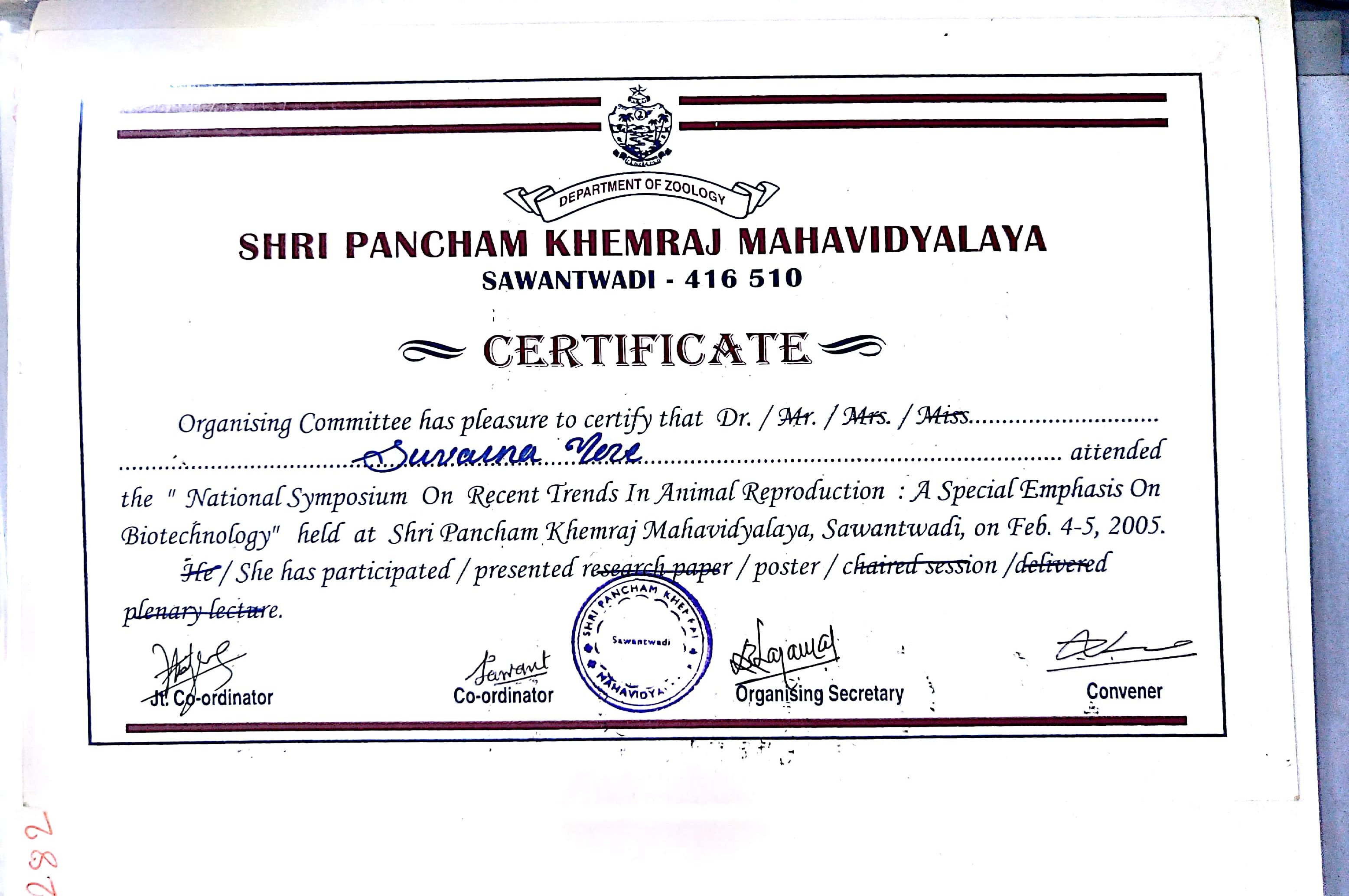 1998-99 Zoology Workshop Local_University Prof. (Dr.) Suvarna B. More Seminar cum Workshop on ‘Recent Trends in Environmental Education’ Sponsored by U.G.C. and organized by Dept. of Zoology, Walchand College of Arts and Science, Solapur. 29-01-1999 3 Attended View View