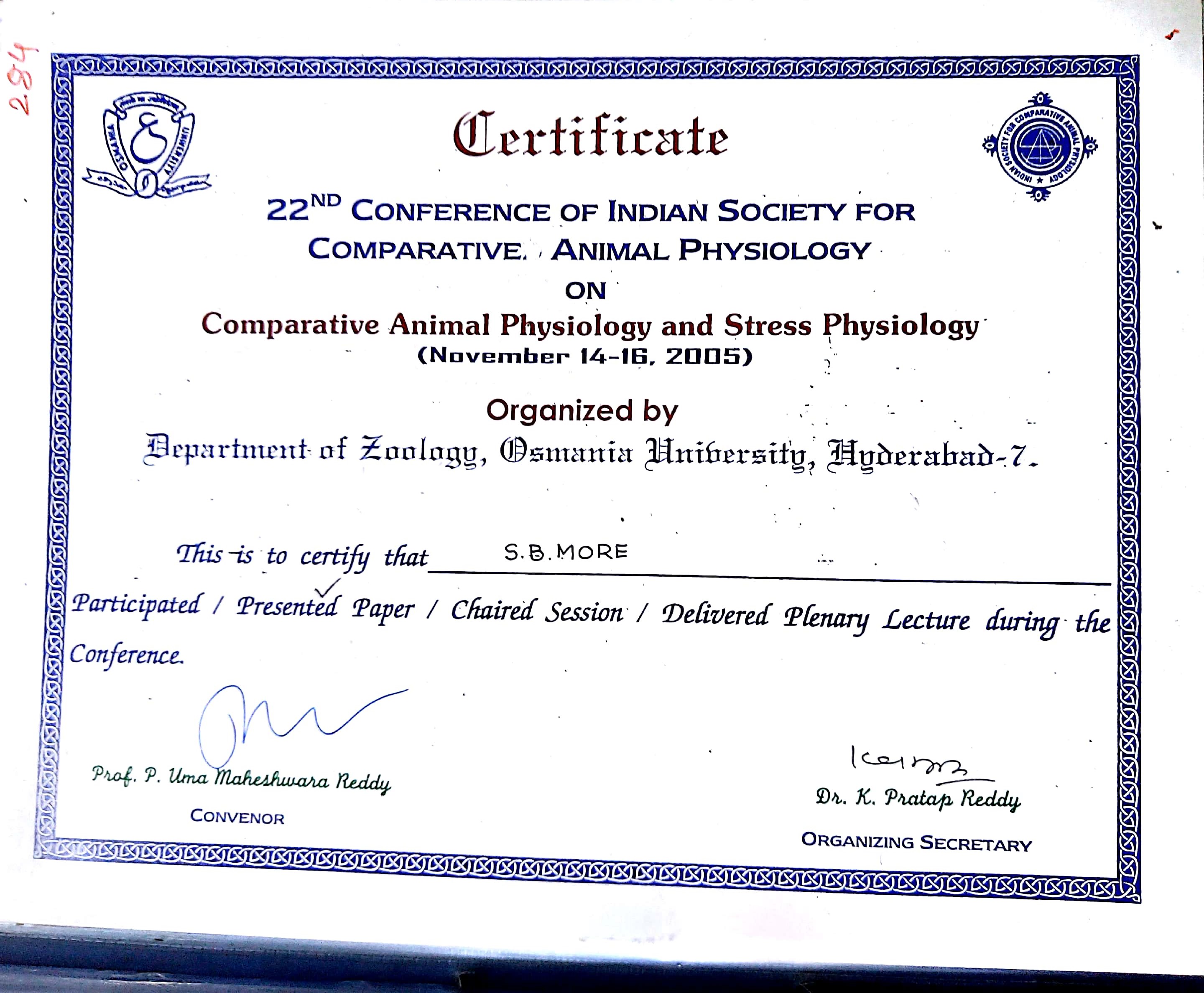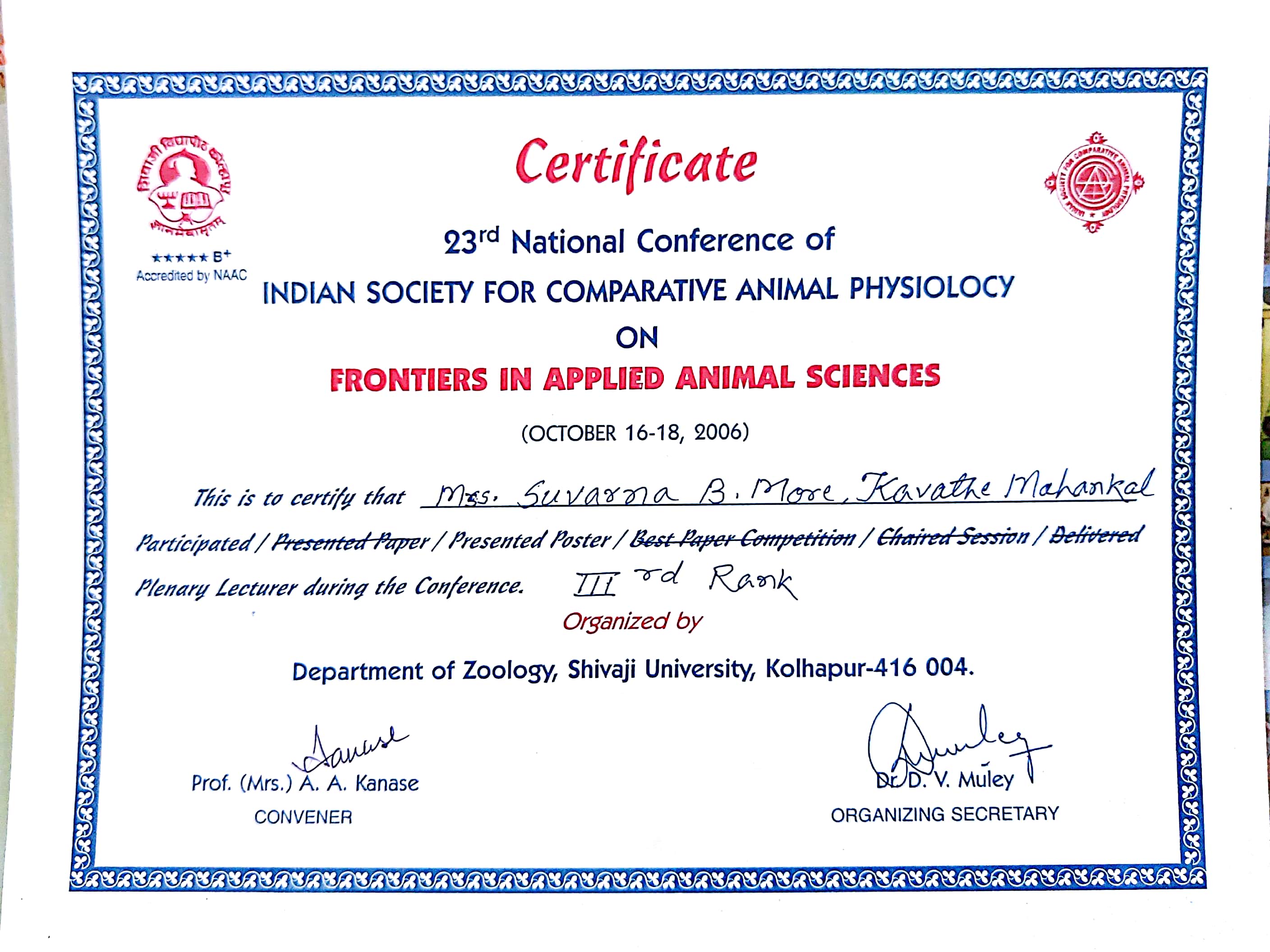 2005-06 Zoology Conference National Prof. (Dr.) Suvarna B. More 22nd Natinoal Conference of Indian Society for Comparative Animal Physiology (ISCAP) on Comparative Animal Physiology and Stress Physiology 14-11-2005 3 Attended_Paper_Presented View View