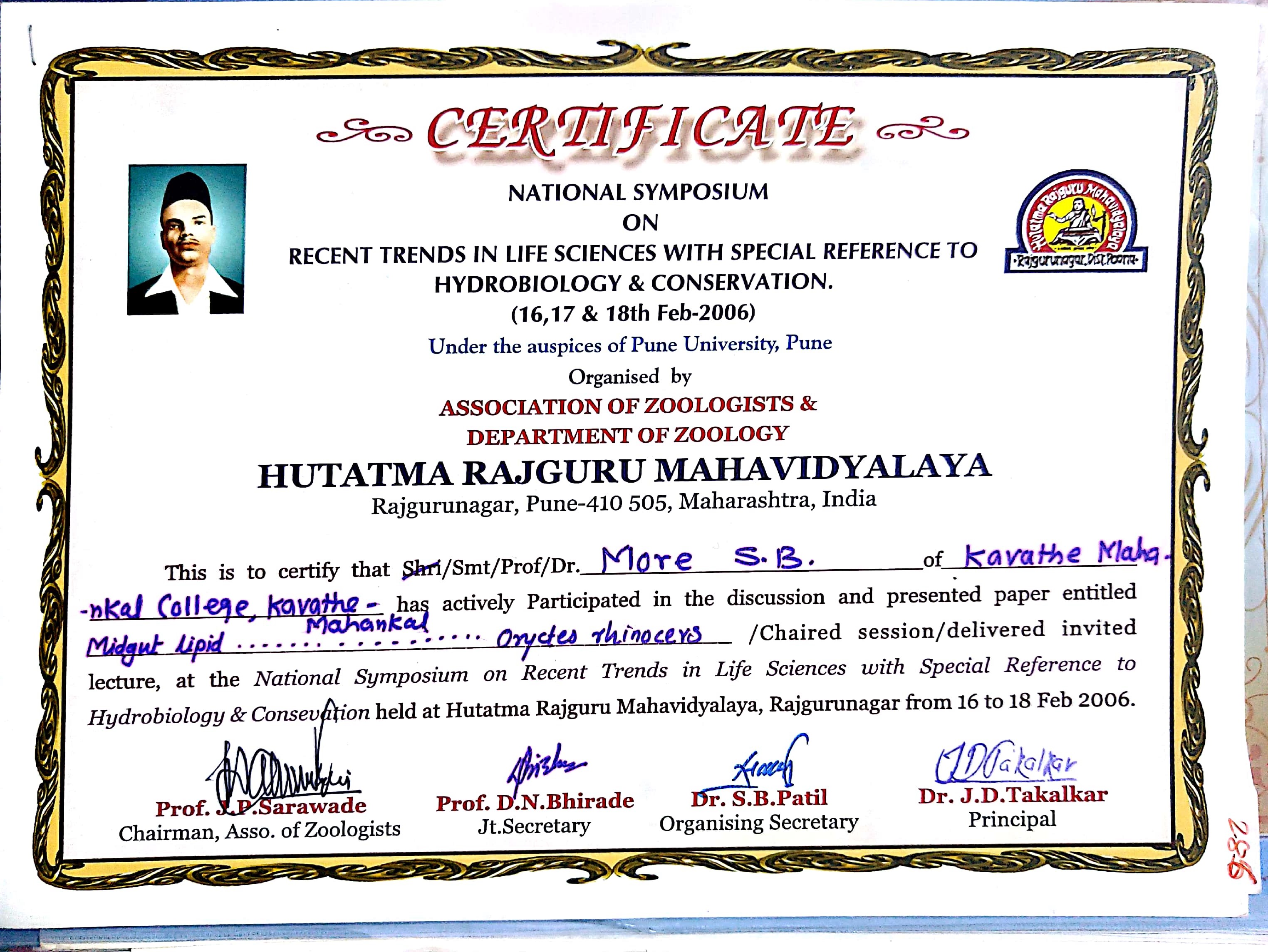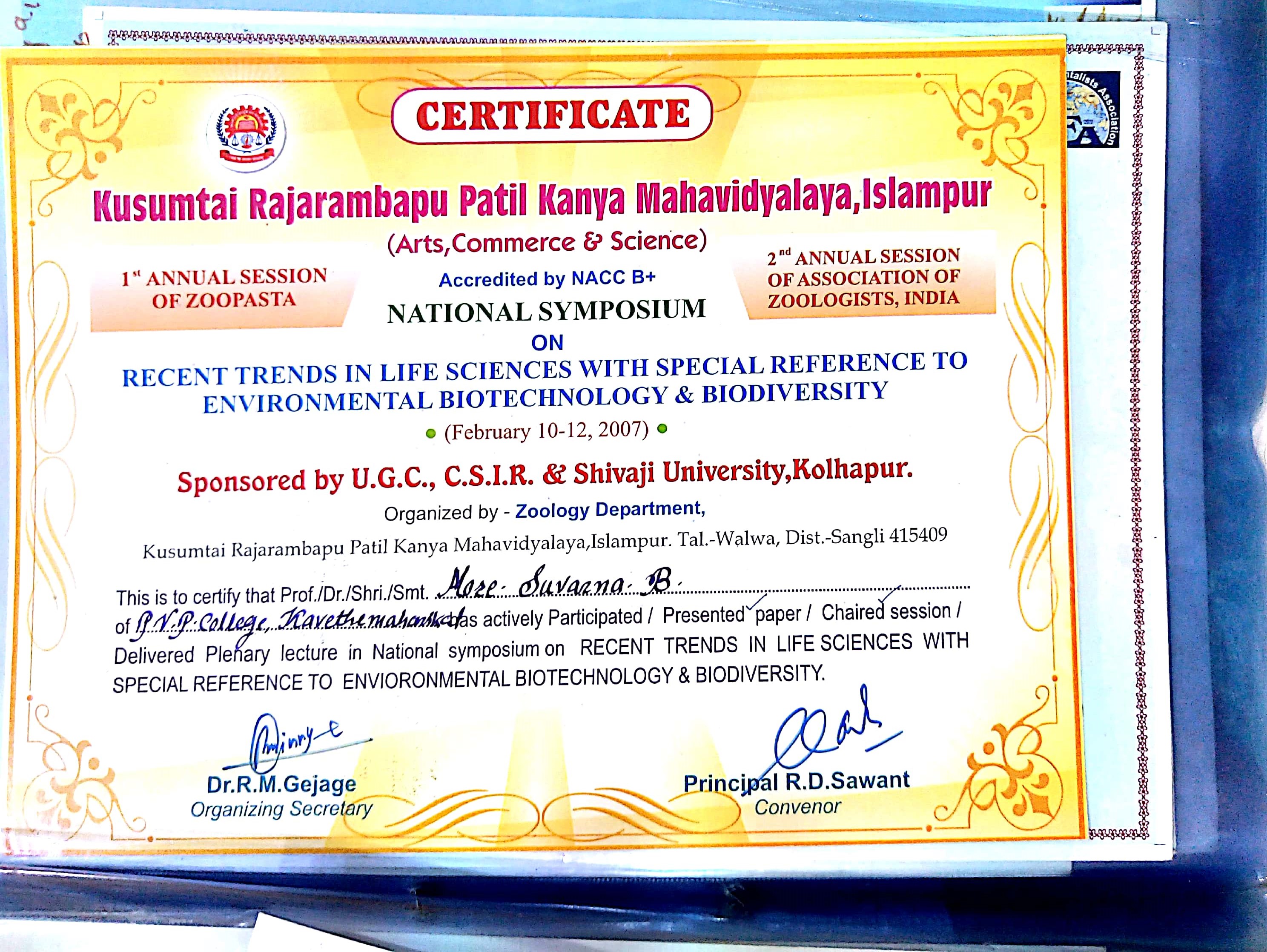 2006-07 Zoology Symposia National Prof. (Dr.) Suvarna B. More National Symposium on Recent Trends in Life Sciences 01-12-2006 2 Attended_Paper_Presented View View