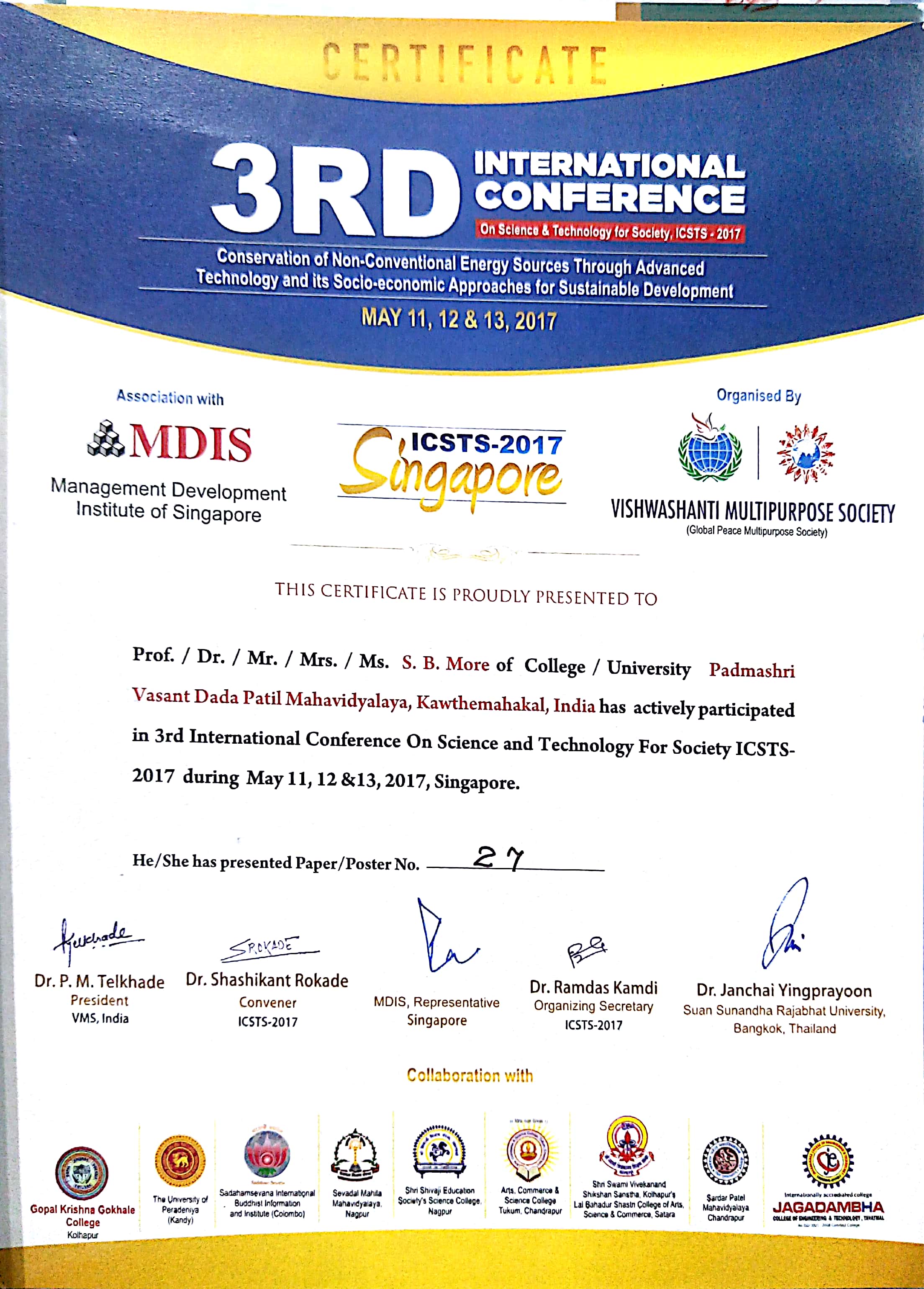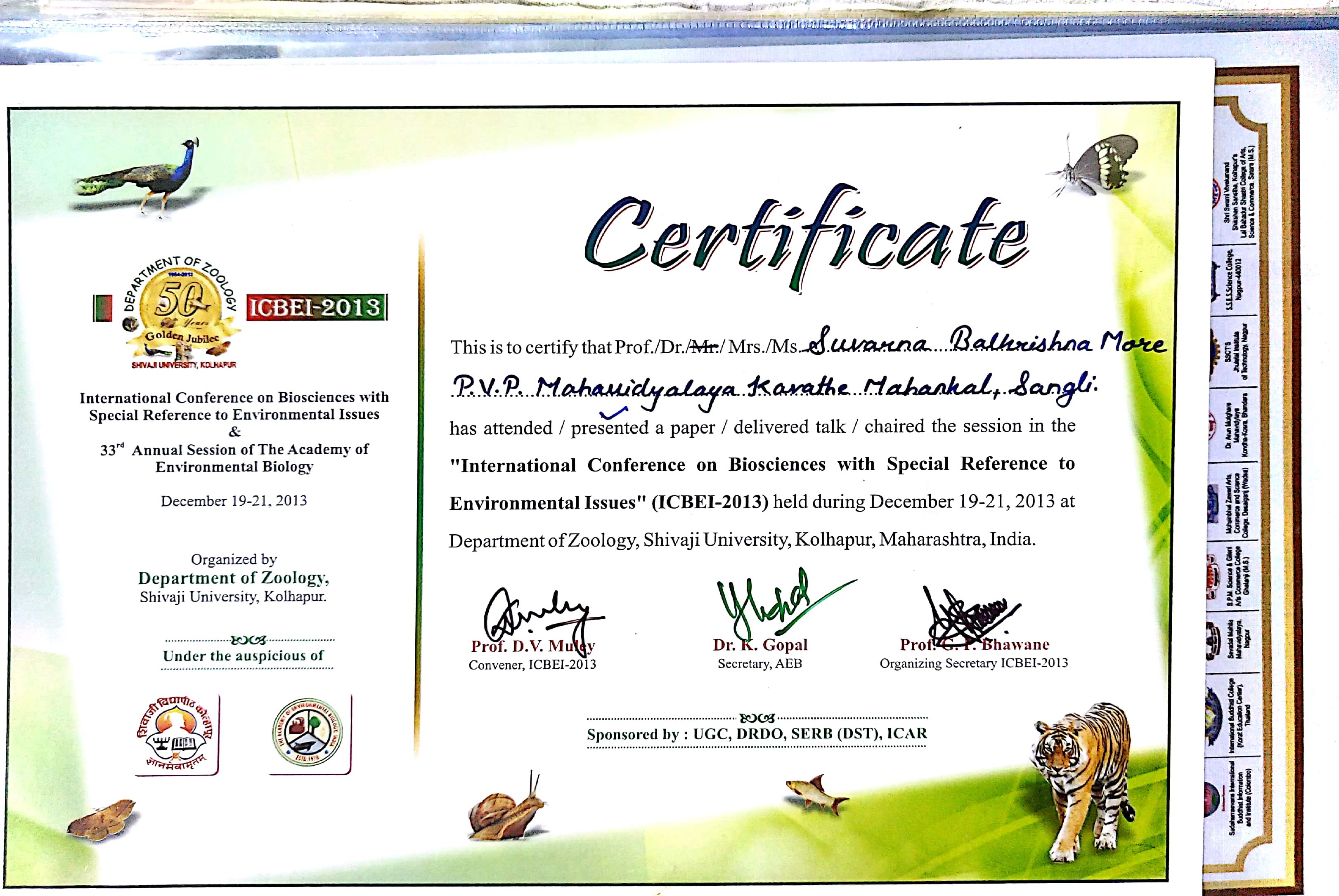 2013-14 Zoology Conference International Prof. (Dr.) Suvarna B. More International Conference on Biosciences with Special Reference to Environmental Issues 19-12-2013 3 Attended_Paper_Presented View View
