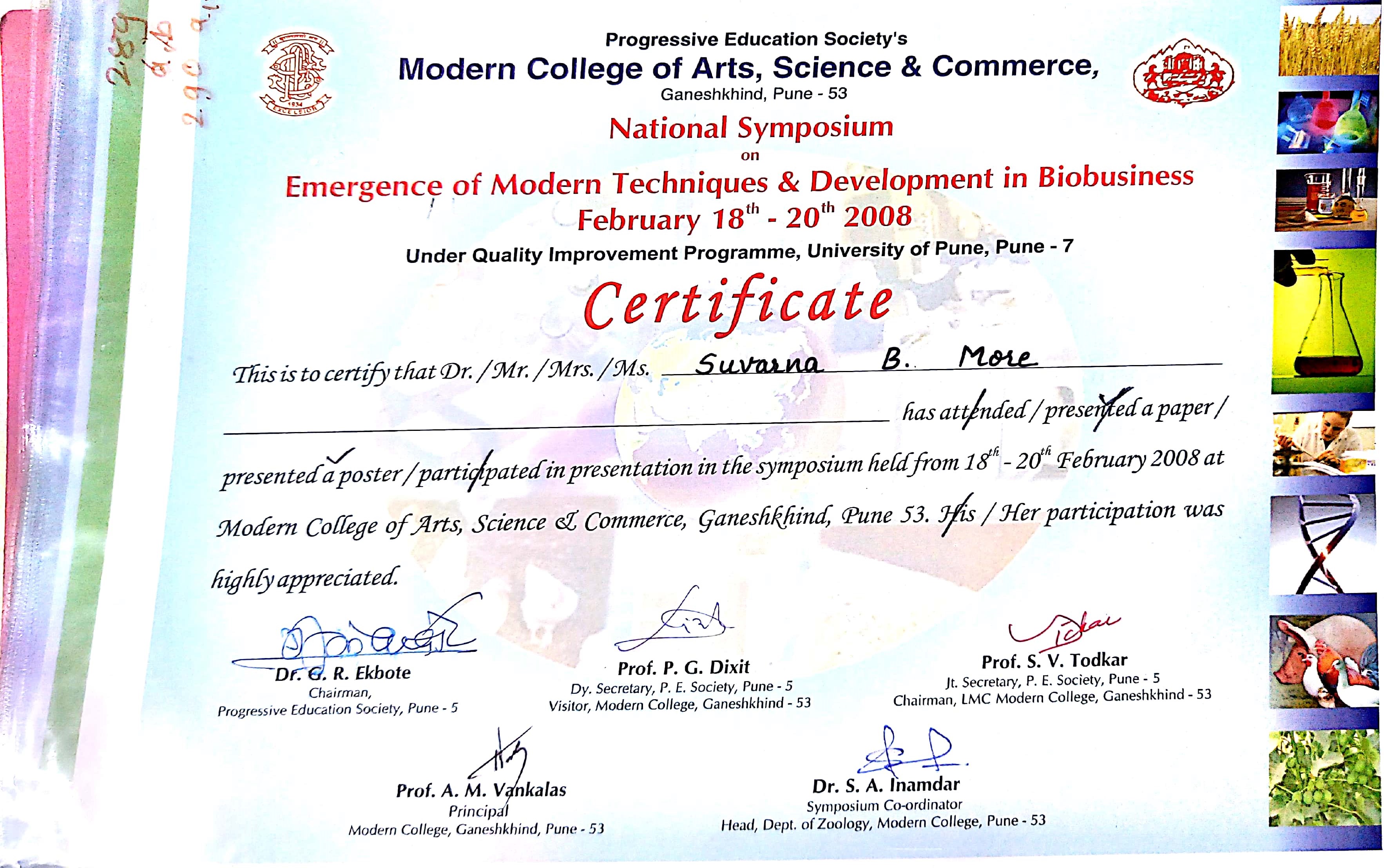 2007-08 Zoology Symposia National Prof. (Dr.) Suvarna B. More National Symposium on Emergence of Modern Techniques and Development in Bio-business 18-02-2008 3 Attended_Paper_Presented View View