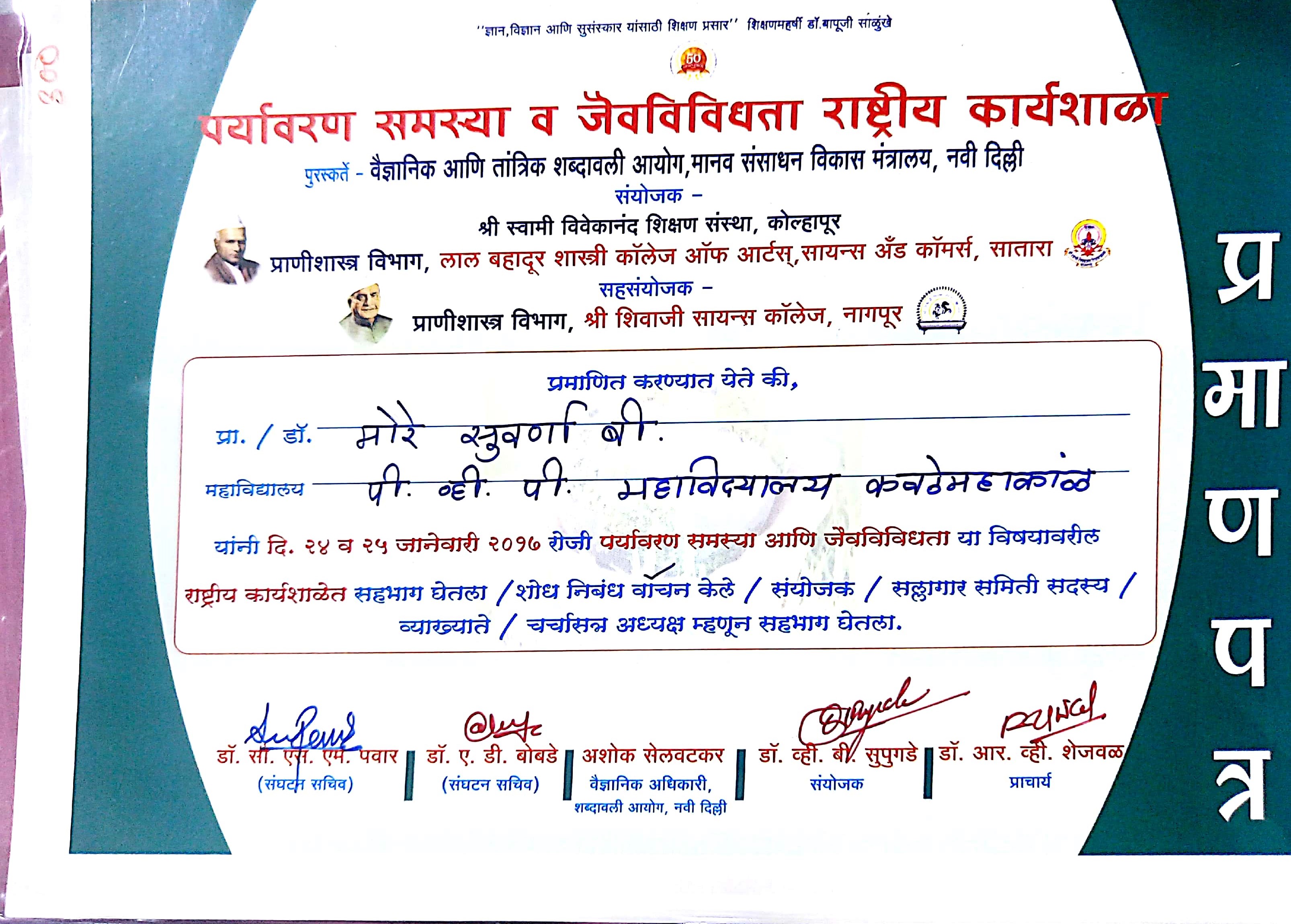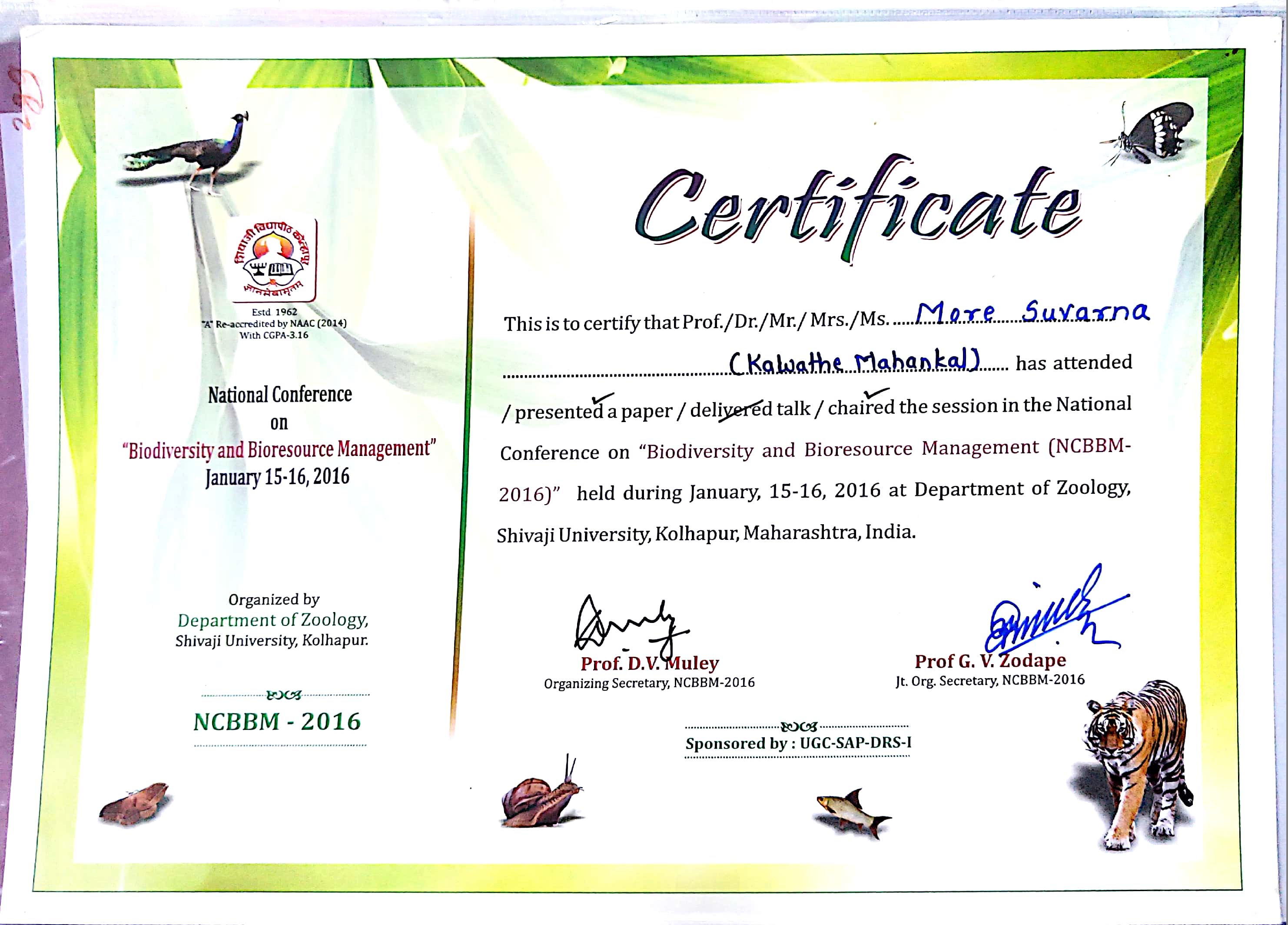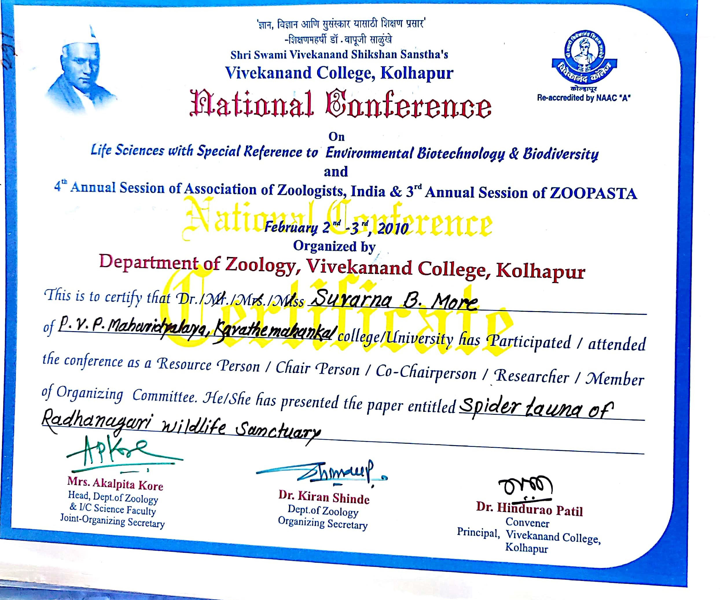 2009-10 Zoology Conference National Prof. (Dr.) Suvarna B. More National conference on Life Sciences Special refrences to Environmental Biotechnology and Biodiversity 02-02-2010 2 Attended_Paper_Presented View View