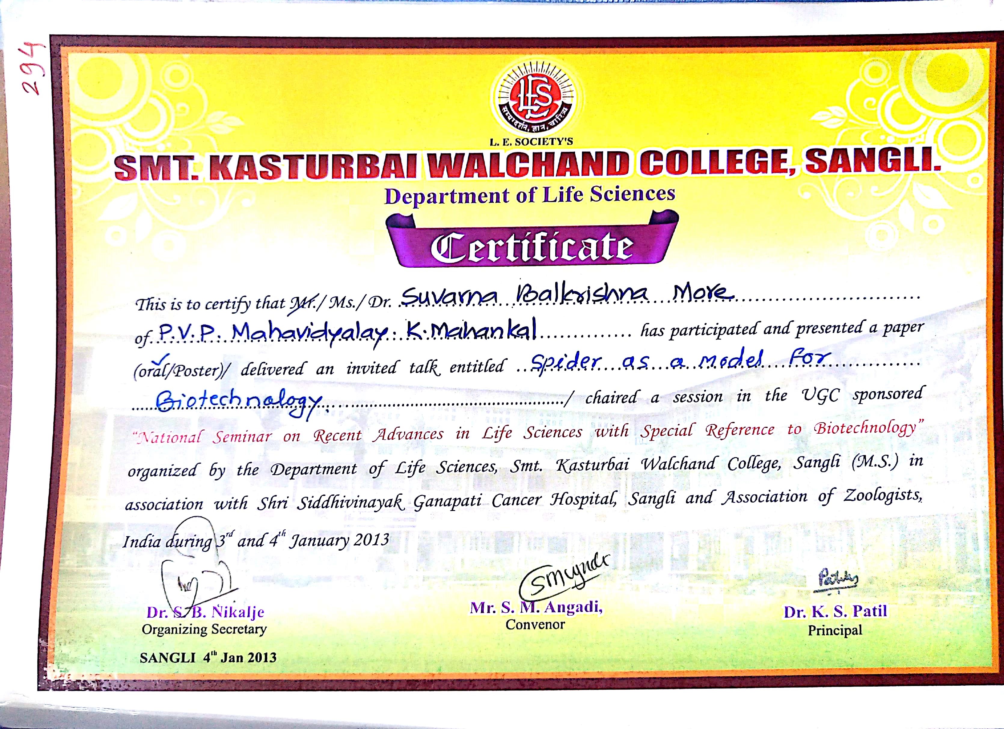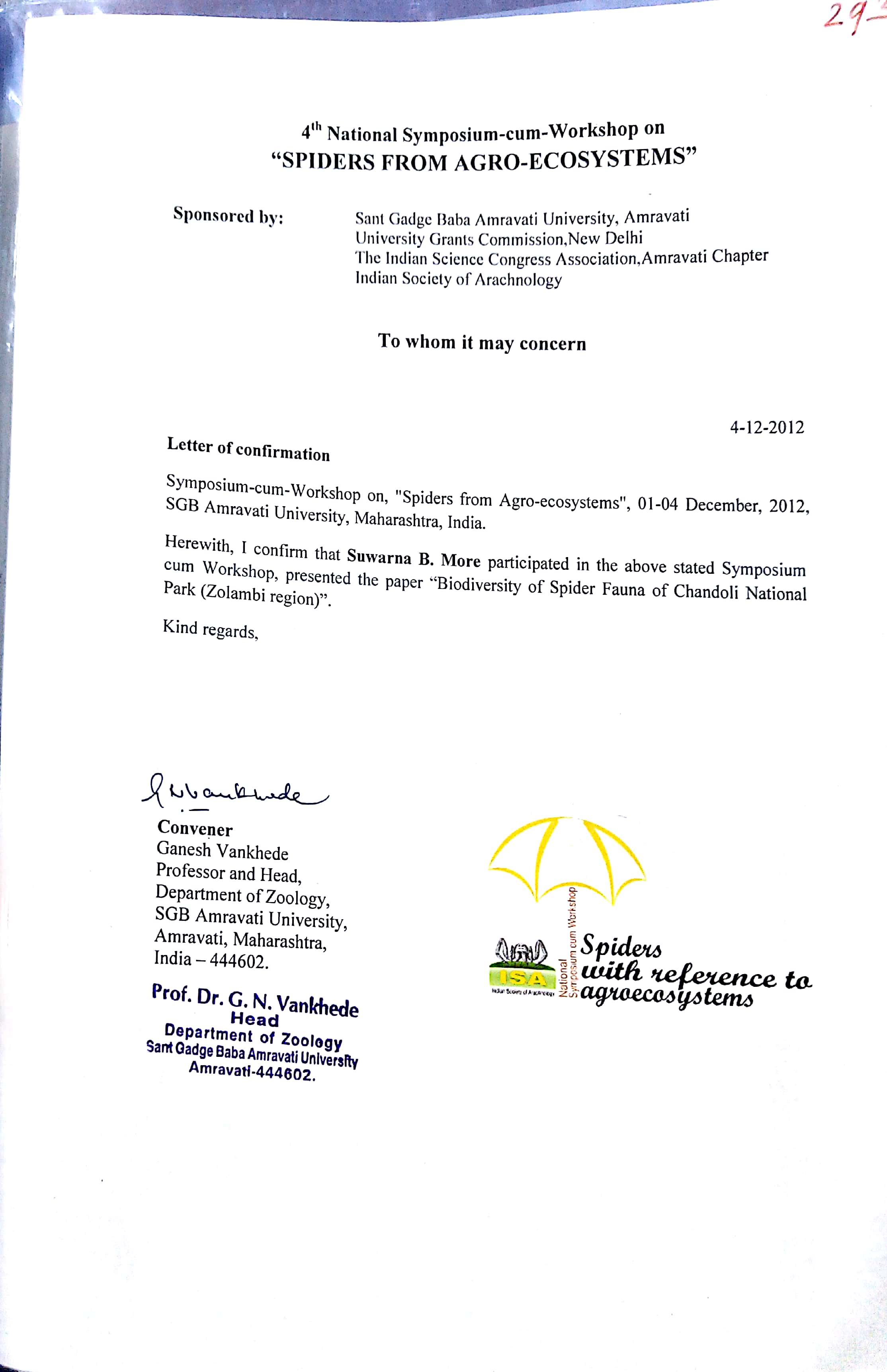 2012-13 Zoology Symposia National Prof. (Dr.) Suvarna B. More 4th National Symposium cum Workshop on “Spiders of Agro-Ecosystems” 01-12-2012 5 Attended_Paper_Presented View View