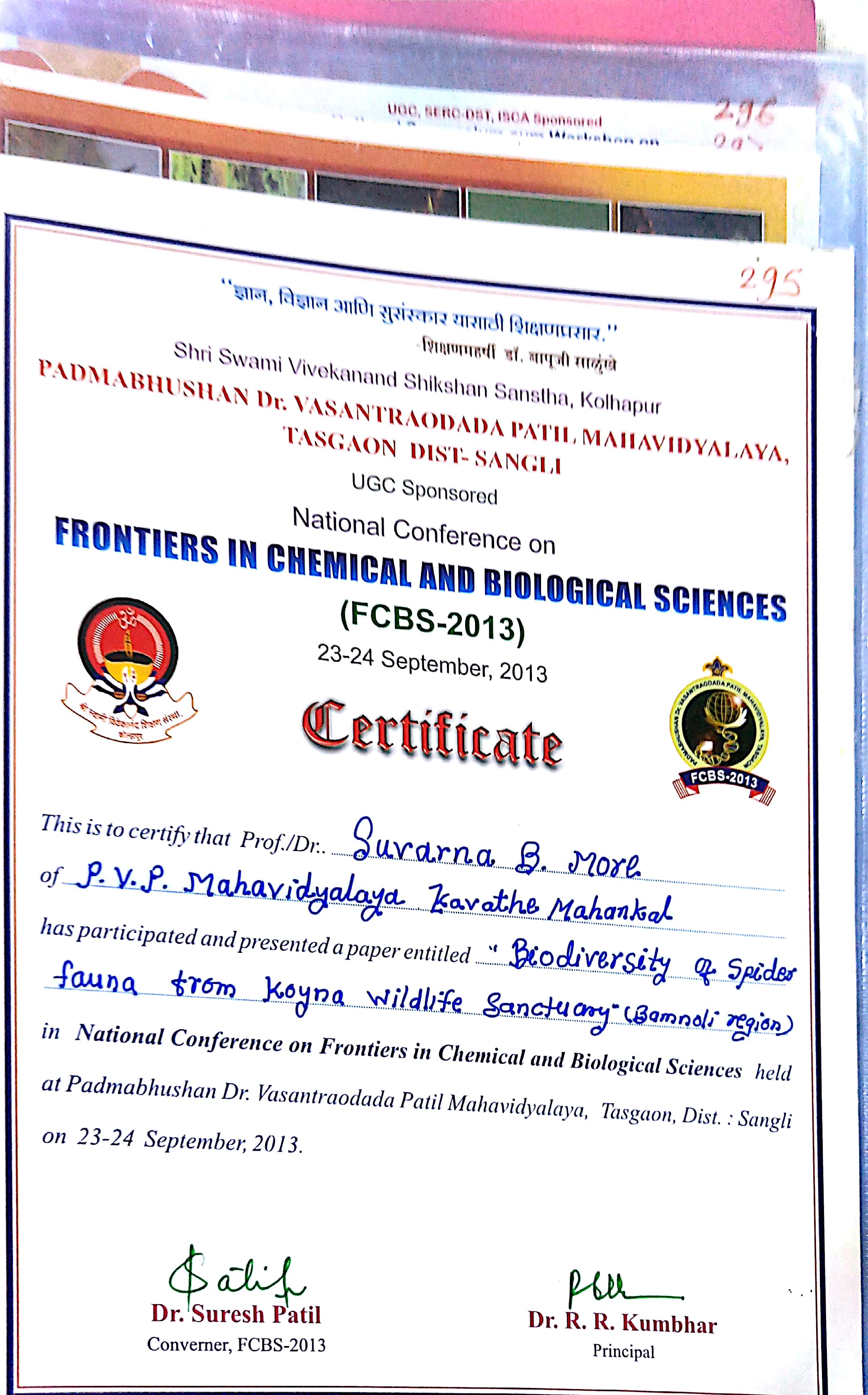 2013-14 Zoology Conference National Prof. (Dr.) Suvarna B. More National Conference on Frontiers In Chemical And Biological Sciences 23-09-2013 2 Attended_Paper_Presented View View