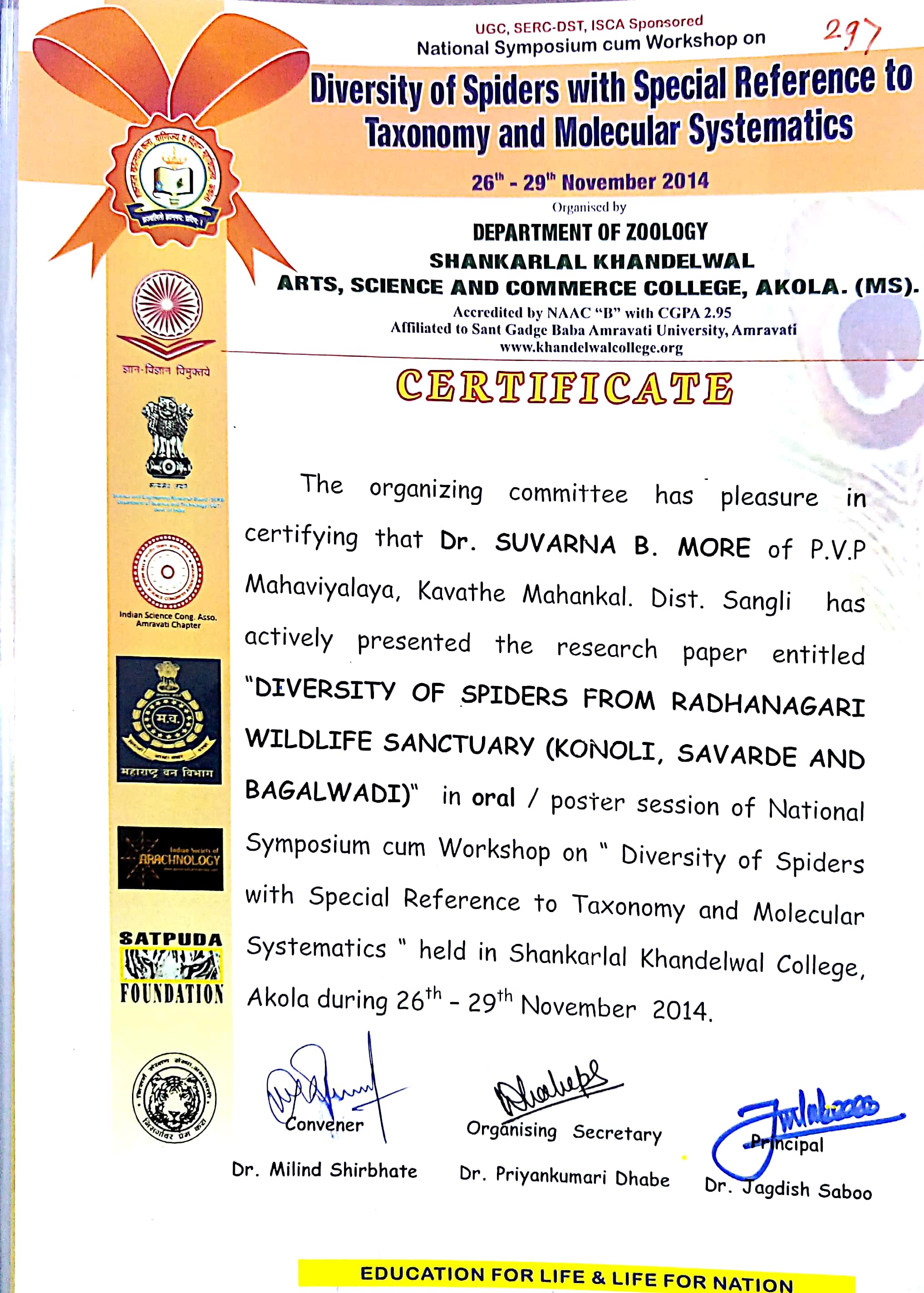 2010-11 Zoology Symposia National Prof. (Dr.) Suvarna B. More Symposium cum Workshop on Arachnology with reference to Spider. 28-11-2010 4 Attended_Paper_Presented View View