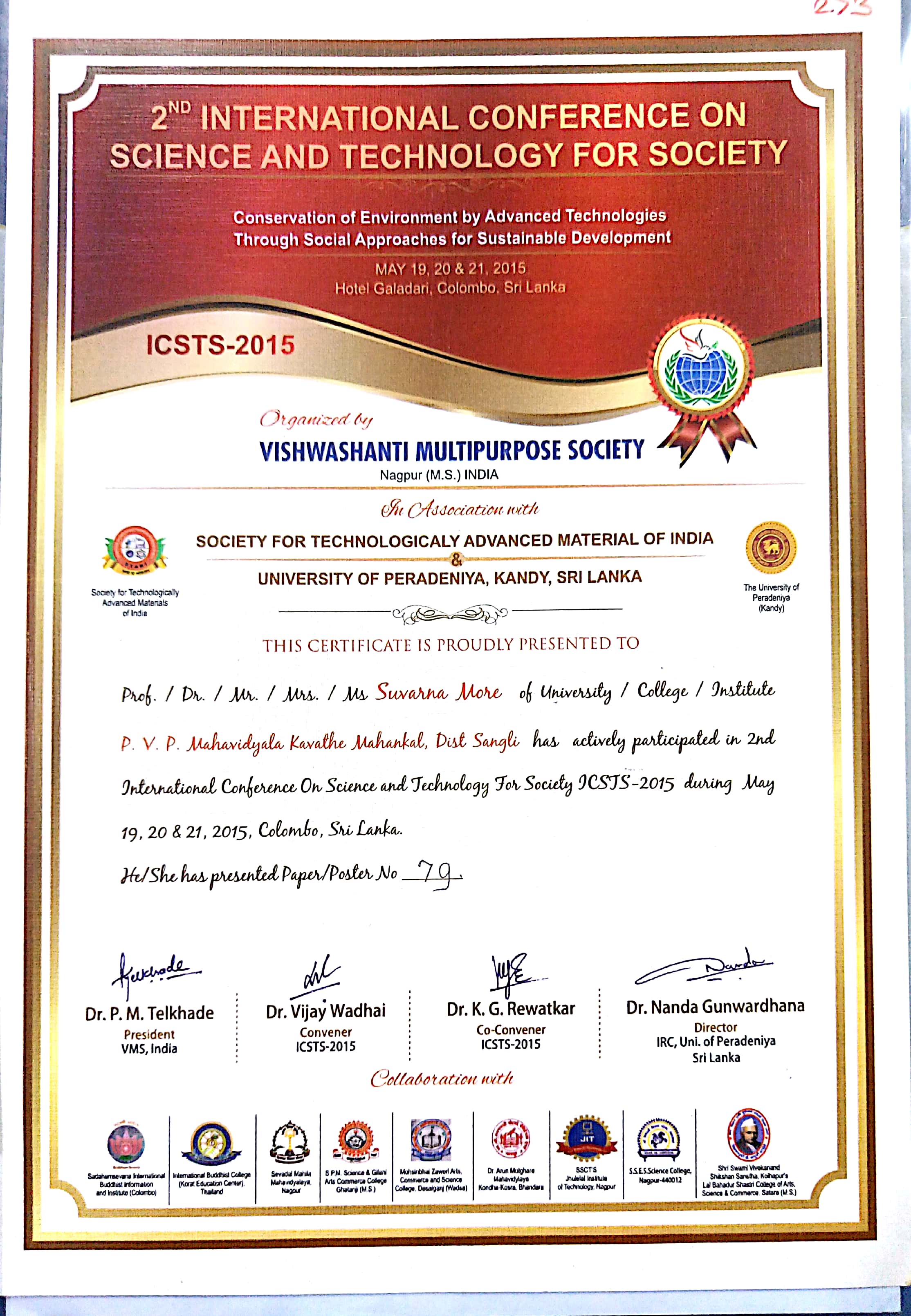 2012-13 Zoology Conference National Prof. (Dr.) Suvarna B. More Two days National conference on Quality, Reliability and Optimization, Organized by P. V. P. Mahavidyalaya Kavathe Mahankal 14-02-2013 2 Attended View View