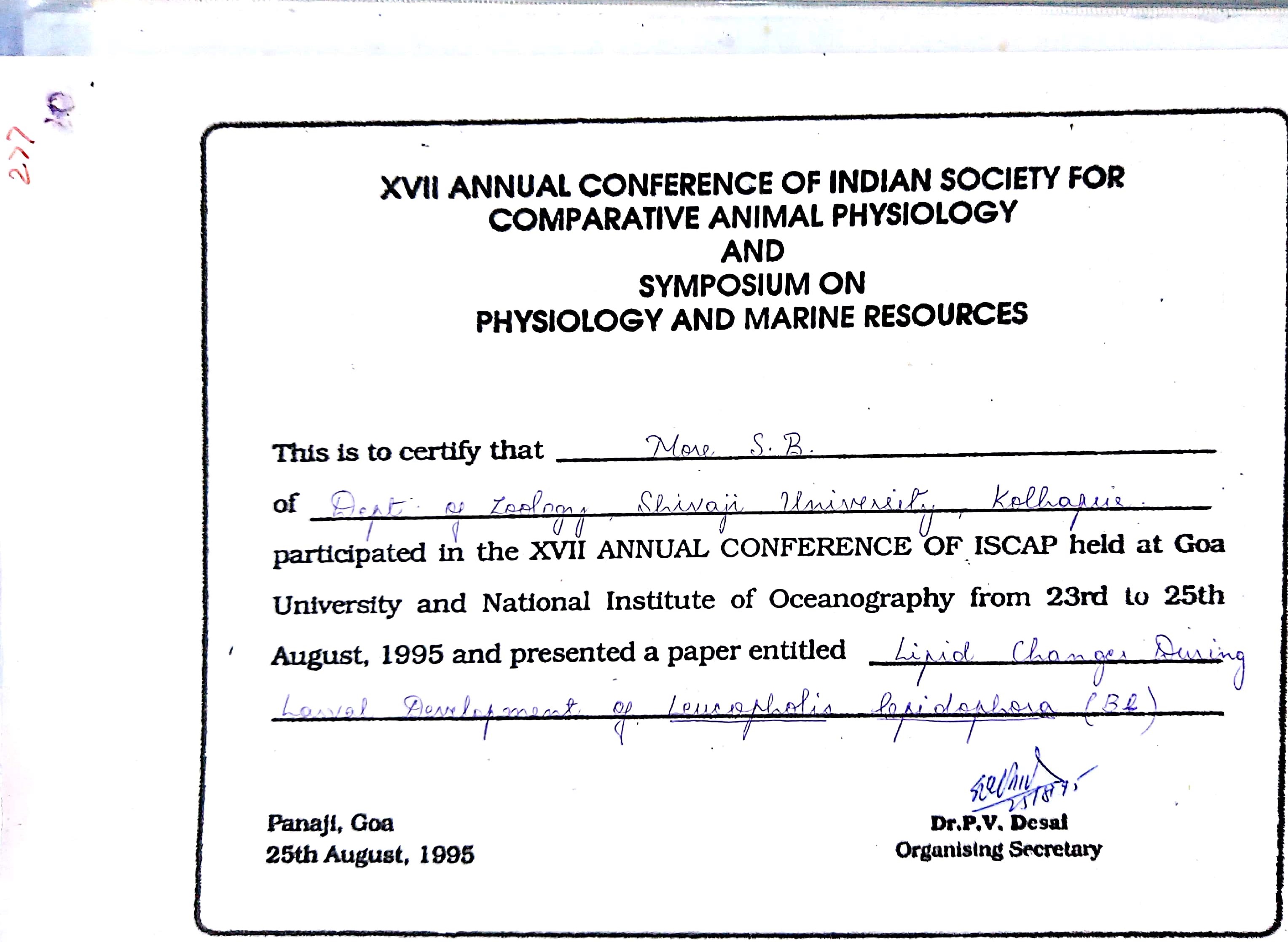 1995-96 Zoology Symposia National Prof. (Dr.) Suvarna B. More XVII Annual Conference of Indian Society for Comparative Animal Physiology and Symposium on Physiology and Marine Resources 23-08-1995 3 Attended_Paper_Presented View View