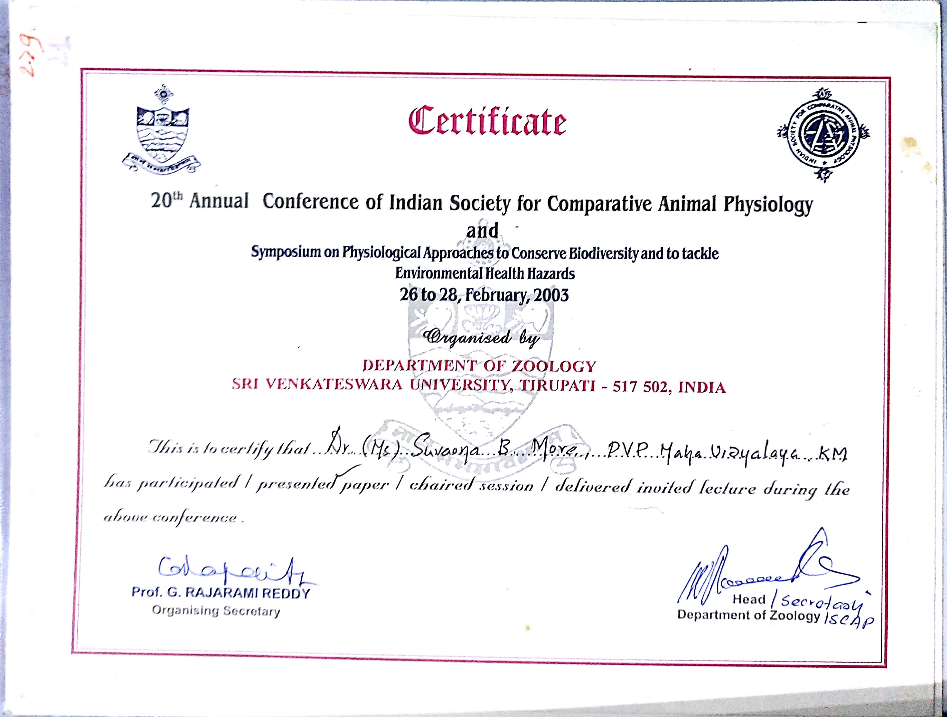 2002-03 Zoology Conference National Prof. (Dr.) Suvarna B. More 20th Annual Conference on Indian Society for Comparative Animal Physiology and Symposium on Physiological Approaches to Conserve Biodiversity and to tackle Environmental Health Hazards 26-02-2003 3 Attended_Paper_Presented View View