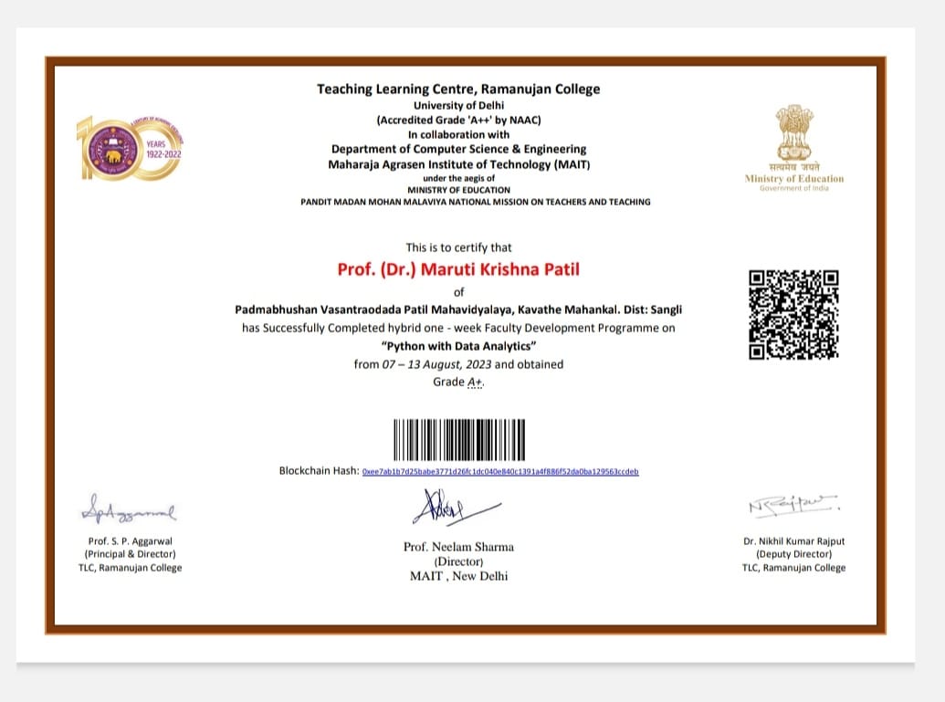 2023-24 Statistics FDP National Dr. M. K. Patil FDP on Python with data Analytics During 7 -13 August, 2023 07-08-2023 7 Attended View View